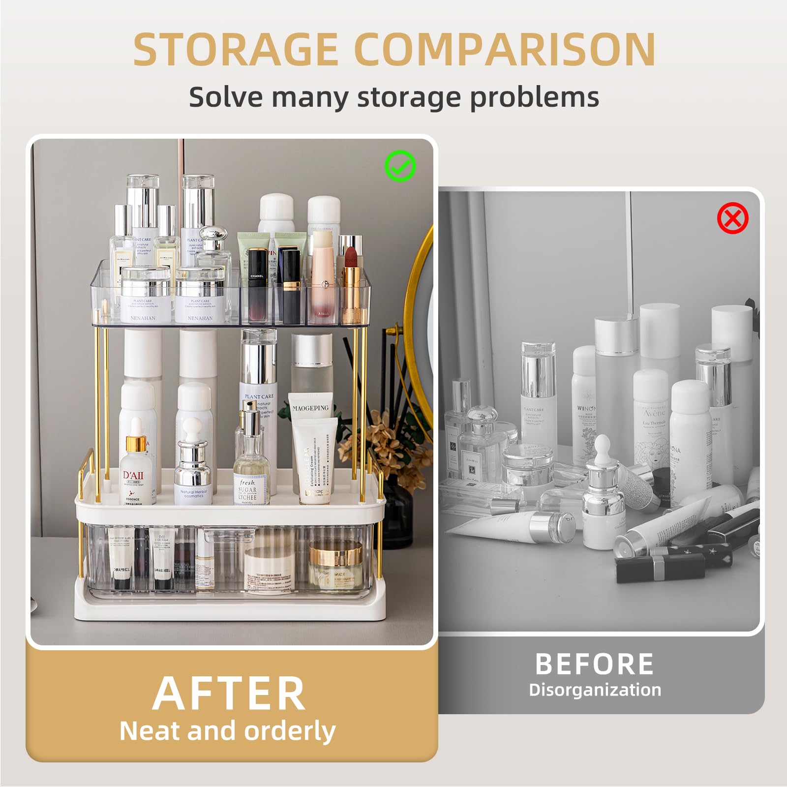 • 💄【Large-capacity Storage】The counter organizer consists of a drawer, a tray, and a divided storage. Size: 12.5*8.3*14 in. It can store a large number of cosmetics, skincare, perfumes, etc, and also has a special lipstick storage slot for accurate storage